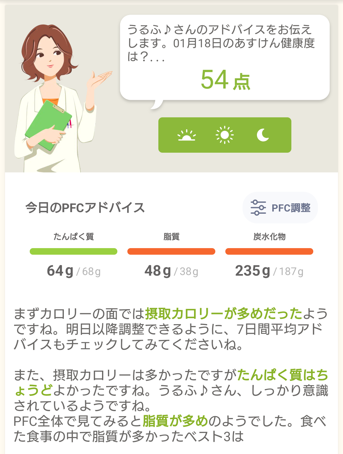 あすけん54点。